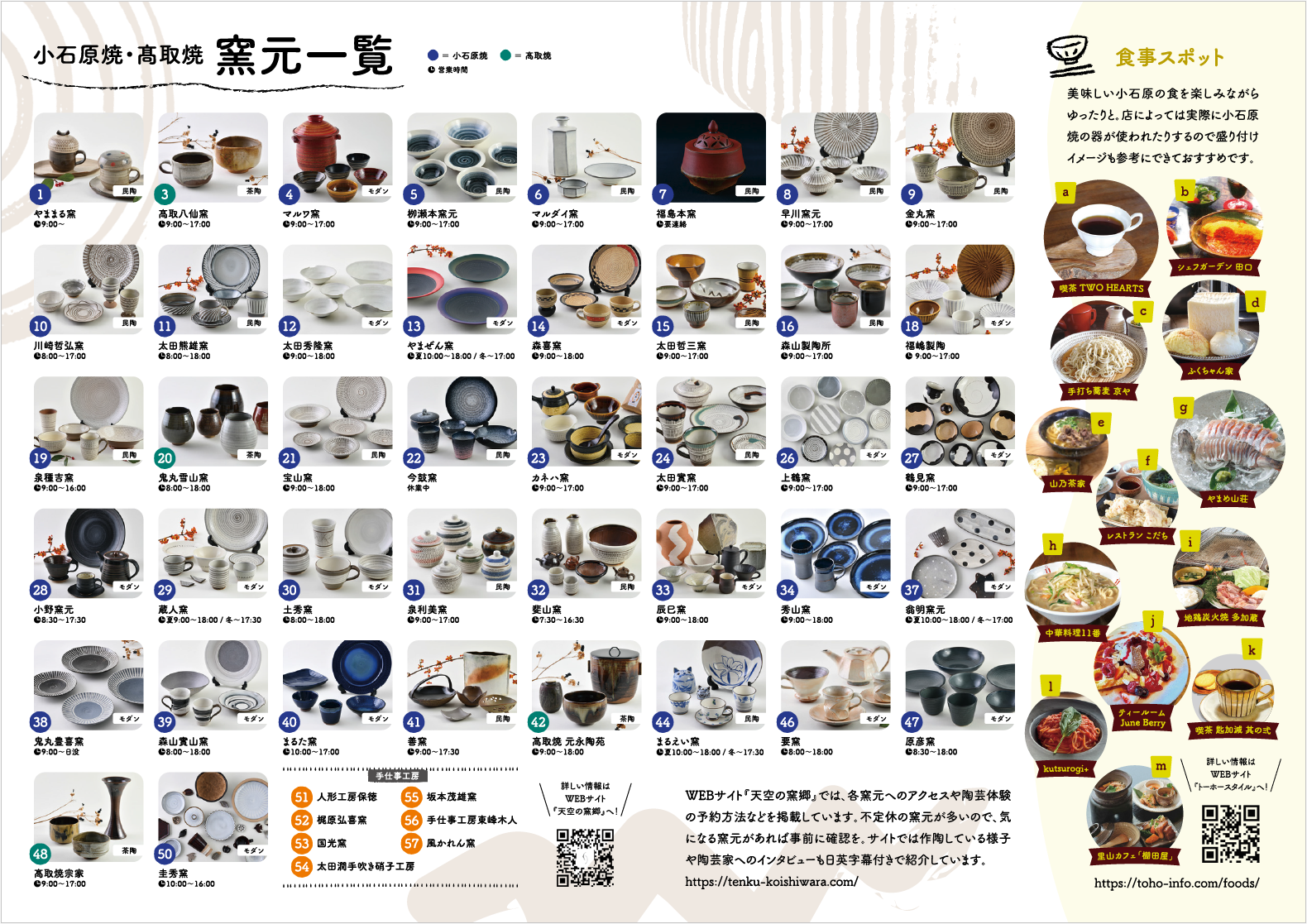本リーフレットでは、各窯元の紹介やエリアマップに加え、飲食スポット、